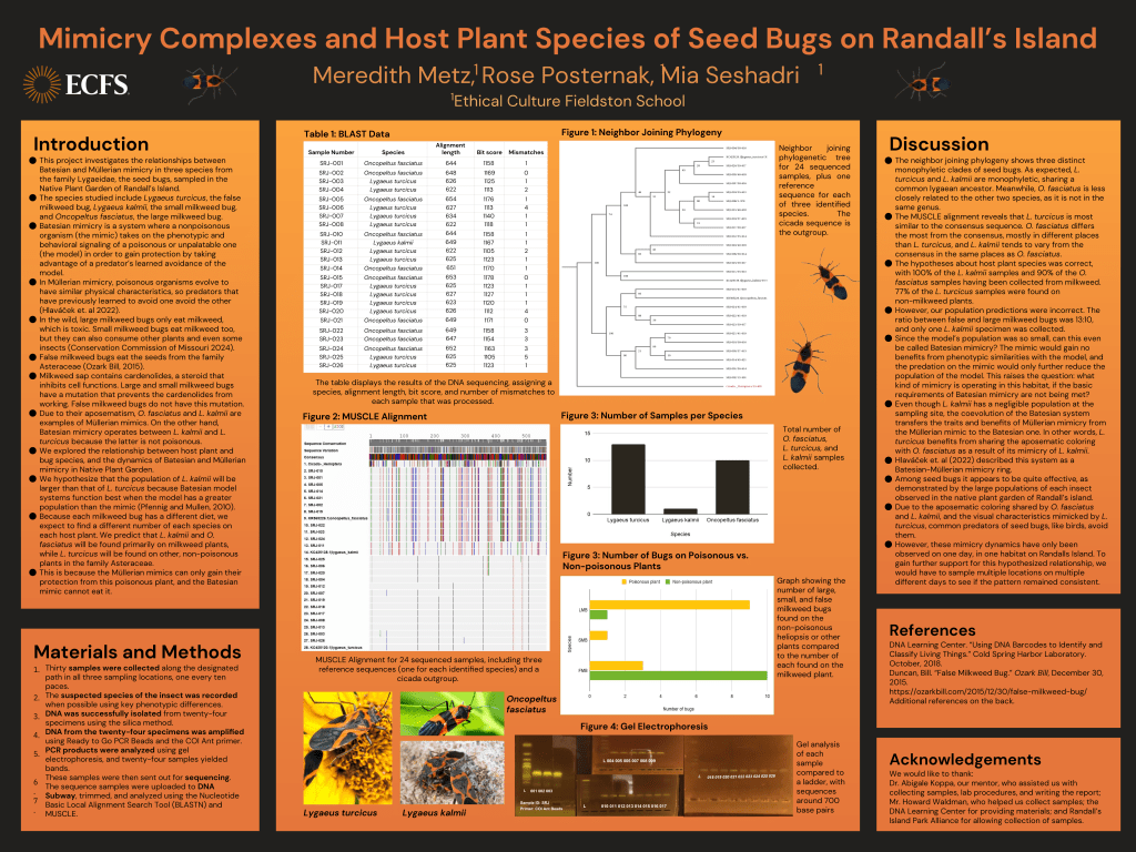 This project investigates the relationships between Batesian and Müllerian mimicry in three species from the family Lygaeidae, the seed bugs. The species studied include Lygaeus turcicus, the false milkweed bug, Lygaeus kalmii, the small milkweed bug, and Oncopeltus fasciatus, the large milkweed bug. They were sampled in the Native Plant Garden of Randall’s Island. Batesian mimicry describes a system where a nonpoisonous organism (the mimic) takes on the phenotypic and behavioral signaling of a poisonous or unpalatable one (the model) in order to gain protection by taking advantage of a predator’s learned avoidance of the model. In Müllerian mimicry, poisonous organisms evolve to have similar physical characteristics, so predators that have previously learned to avoid one avoid the other (Hlaváček et. al 2022).