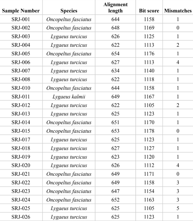 The table displays the results of the DNA sequencing, assigning a species, alignment length, bit
