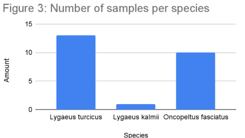 The hypothesis that the small and large milkweed bugs would mainly be located on milkweed was confirmed, with 100% of the L. kalmii samples and 90% of the O. fasciatus samples having been collected from this kind of plant. Additionally, around 77% of the L. turcicus samples were found on non-milkweed plants, demonstrating their diet as well.