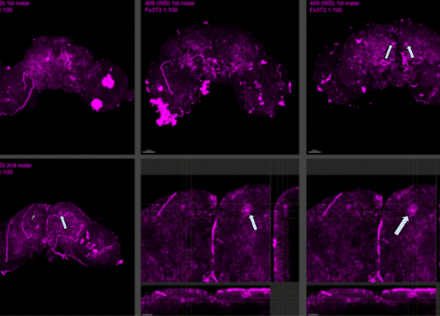 In multiple brains of 409 wingless samples, staining with the FS3-specific in situ hybridization probe revealed a noticeable difference in brightness compared to winged samples. This increased brightness in wingless brains is likely due to the probe targeting both FS1 and FS3 transcripts, whereas in winged samples, the probe only targets FS1. This dual staining in 409 suggests that FS1 and FS3 are co-expressed within the same brain domain. The expression follows a distinct pattern through the optic lobes, aligning with areas associated with glial progenitors, while the front and top regions correspond to neurosecretory cells. These glial progenitor cells are immature cells in the brain and spinal cord that can develop into different glial cells, which support and protect neurons. These cells play a key role in brain development and repair. The increased probe signal in 409 samples highlights the overlap in FS1 and FS3 expression, resulting in a doubling of transcript detection compared to winged counterparts.