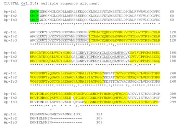 The cleavage site, a specific point where enzymes divide a protein into segments, serves as a reference point for understanding protein function and evolution. By aligning protein sequences after the cleavage site, regions of similarity that may indicate function or structural relationships can be identified. In this case, the Fs genes in three aphids show high similarity, suggesting that the change in role from development (fs1) to female environmentally induced winglessness (fs2) to genetically determined winglessness (fs3) is driven more by changes in gene regulation than by alterations in the protein sequences themselves. Highlighted regions in the alignment represent binding sites where neurosecretory cells can trigger intracellular processes. These findings suggest that while variations in protein sequences exist, they likely play a relatively minor role compared to regulatory changes in shaping the functional adaptations of aphids.